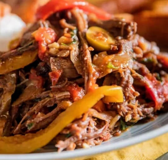 Ropa vieja is a traditional Latin American dish made of shredded beef slow-cooked with tomatoes, peppers, onions, and spices. Its name comes from the meat's ragged appearance, resembling old clothes. Served with rice or plantains, it's a flavorful and comforting meal.